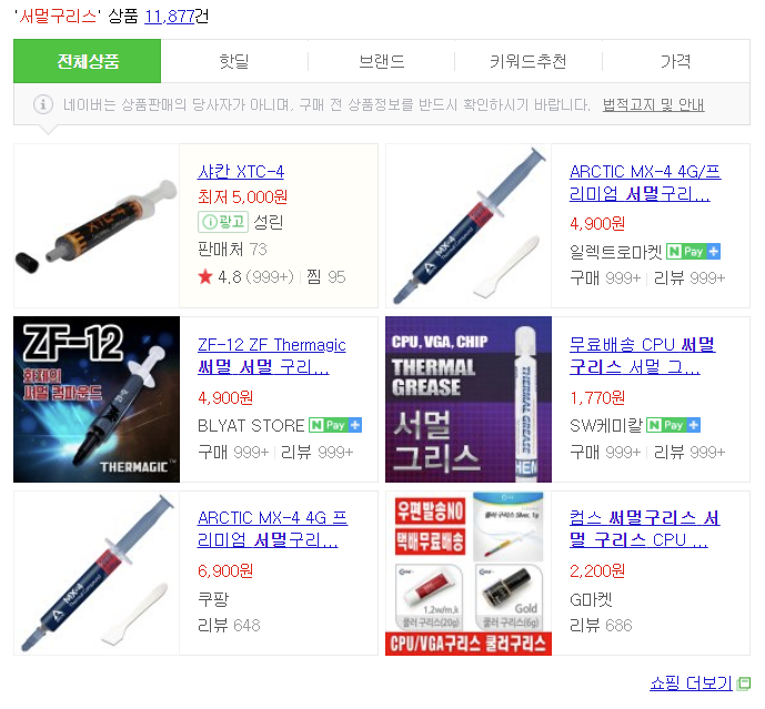 일단 서멀구리스 같은 경우, 네이버에 검색만 해도 여러 가지 제품이 많이 나옵니다.