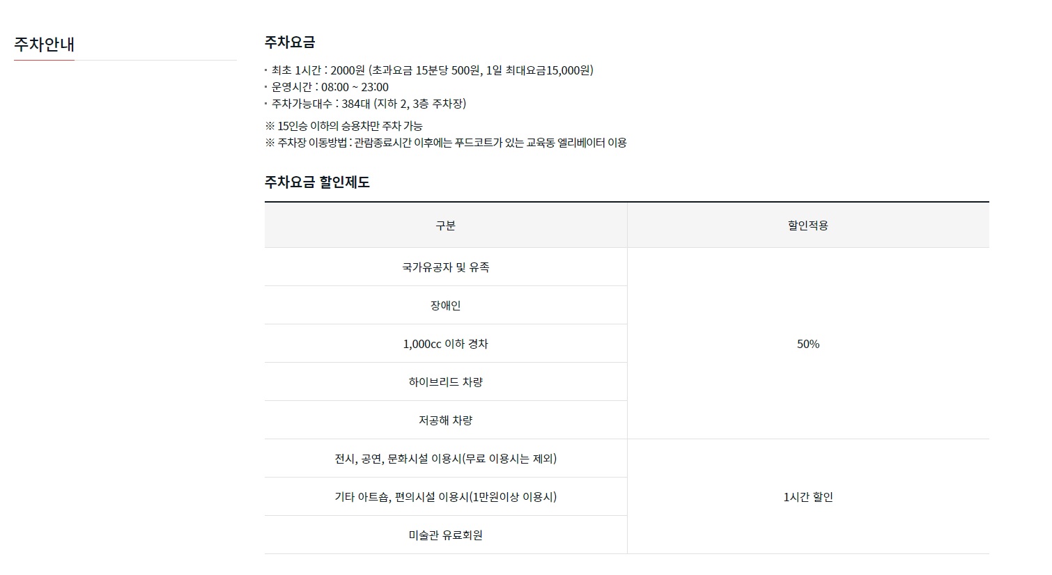 아래는 국립현대미술관 공식 홈페이지에서 가져온 주차장 요금표 사진입니다.