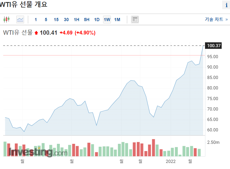 지난번에 이미 100달러를 한번 찍고 내려간 적이 있지만 아무래도 전쟁 때문에 세계의 정세가 불안해서 그런지